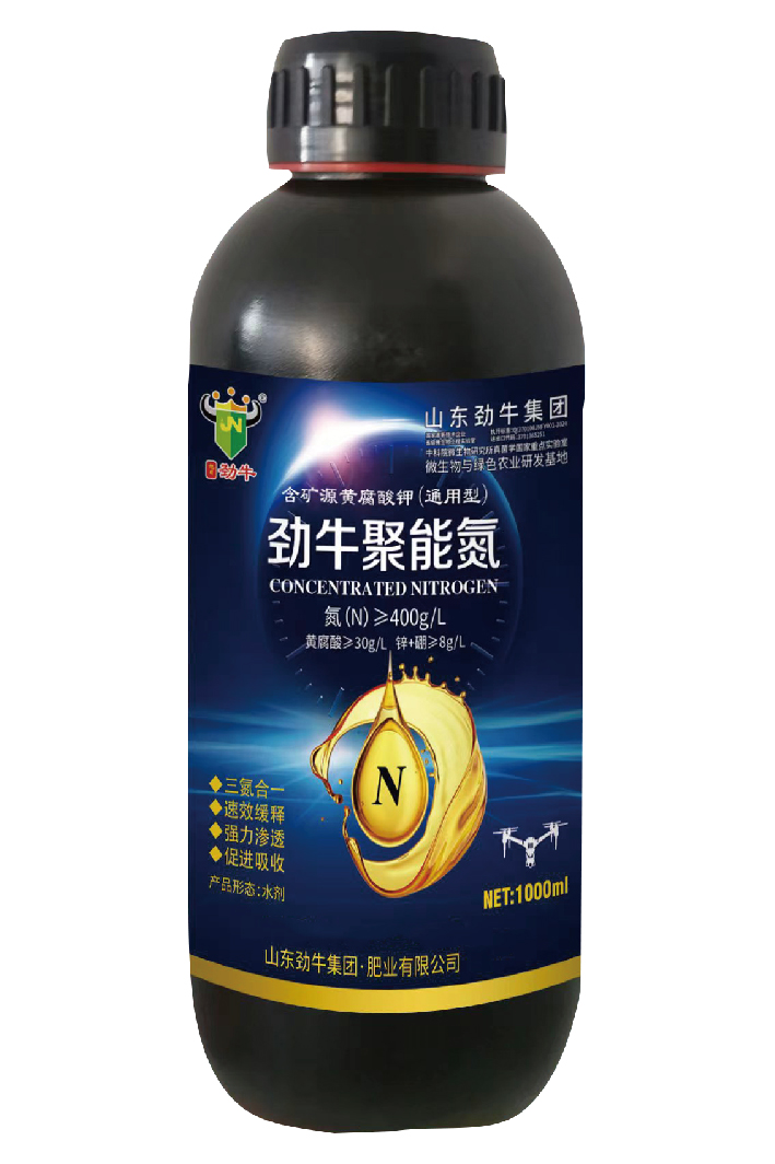 劲牛聚能氮是一种“三氮合一”稳定性缓释氮肥,加入有机硅、矿源黄腐酸钾及多种中微量元素等。利用缓释和螯合工艺加工而成。不烧叶,不烧苗,安全可靠。“三氮合一”具有即速效又缓释,确保养分均衡、持久被作物吸收。喷施本品后,迅速作用于植物细胞终端,使作物吸收快,持效期长,肥料利用率高达90%以上,是传统尿素利用率的3倍。近年来,化肥开始进入叶喷和飞防时代,而肥料的选择发生了翻天覆地的变化,补充氮肥有了新的肥料选择一液态氮肥,施用液态氮肥,见效快,持效期长,节约能源、利用率高,且省工省时,节约化肥投入,提高品质,增加产量。从此,氮肥进入叶喷和飞防时代“新纪元”!注意事项:本品应贮存于阴凉干燥处,叶面喷施应避开烈日,喷施后4小时内遇雨应重喷,可与非碱性物质混用,可起到增效作用。